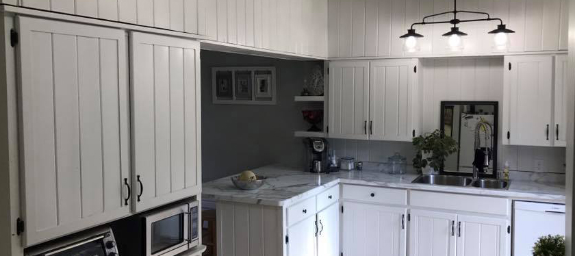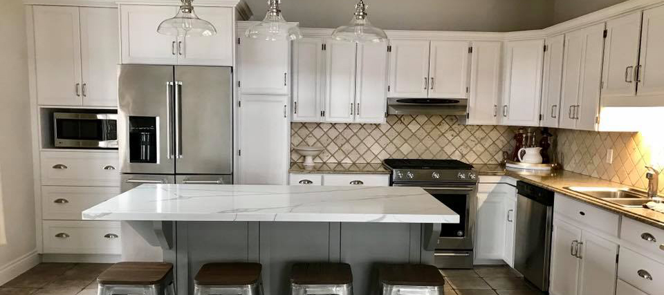 Our process of refinishing offers a professional sprayed finish in almost any colour you can imagine. Our process begins with a regiment of prep work that & using only the very best possible spray equipment & products results in a finish that brings new life to those dated but still fully functional kitchen cabinets. Add new hardware, a backsplash and maybe some new flooring & you have a complete kitchen renovation for less than the starting cost of cabinets that aren’t even real wood.